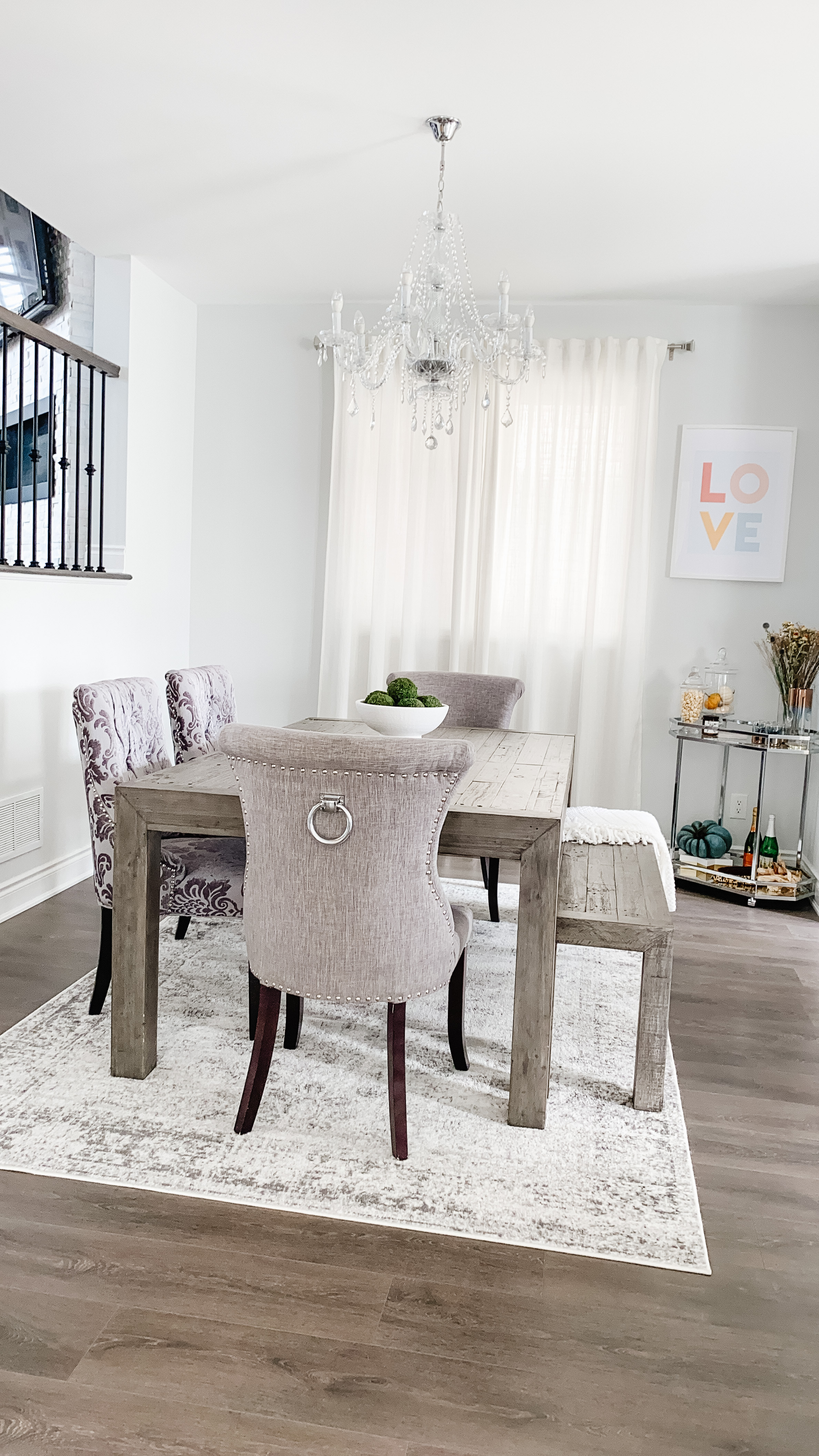 I just gave my dining room a makeover! I felt like it had become a bit outdated and I wanted to bring the space more warmth and a trendy feel. I don’t have a separate dining room but it is connected with my kitchen. So not only is it my dining room but it’s also breakfast, craft, and home office area.  When decorating or designing a space, I always keep in mind that it must be kid-friendly. This dinning table is perfect when it comes to trendy pieces, not to mention it’s quite durable too which is great for when kids are around. This reclaimed wood table and bench are very easy to clean and the imperfect texture is ideal for what it goes through on the daily!
