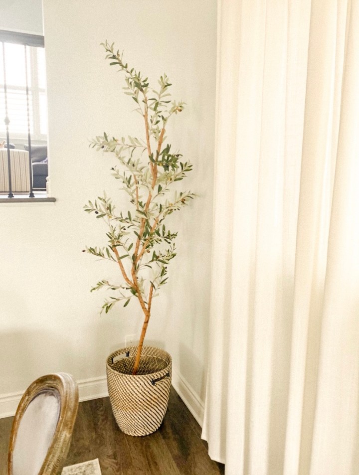 Lastly, I added an olive tree in the corner to add some colour, texture, and warmth to the space. I added touch of light grey with the 5’x7’ area rug and to make the space look bigger.