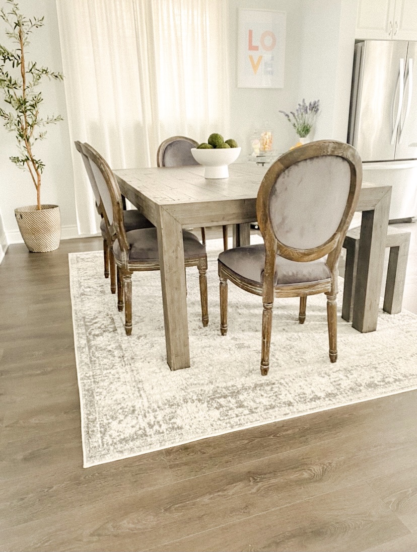 This room was so much fun to play around with. I wanted to give this room a vintage French feel with a modern touch. I swapped out my old fabric chairs to these Oak Wood chairs.  These chairs have velvet fabric, which I find easy to clean spills than on the fabric chair.