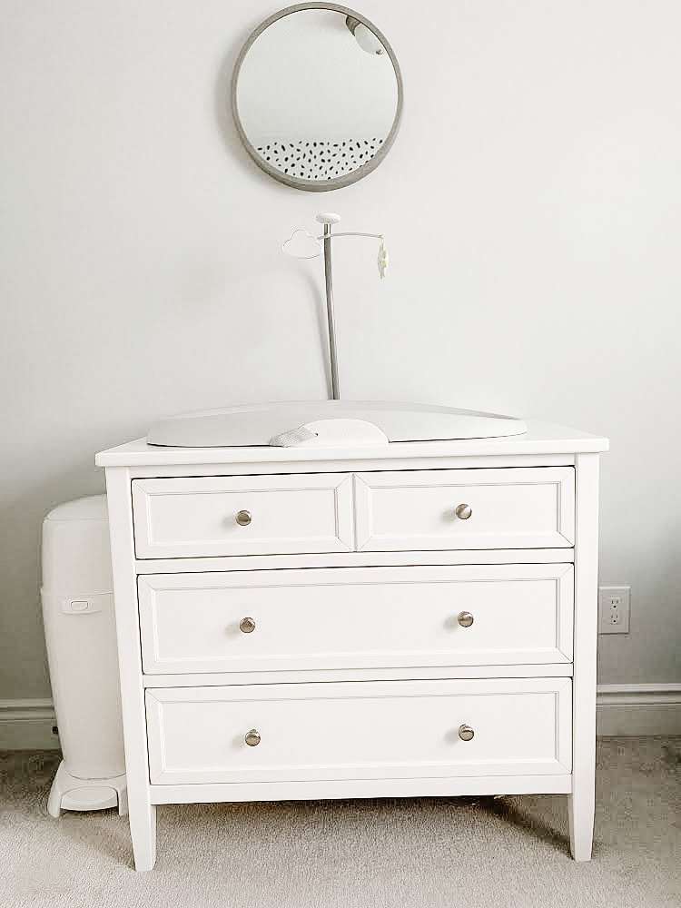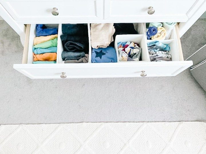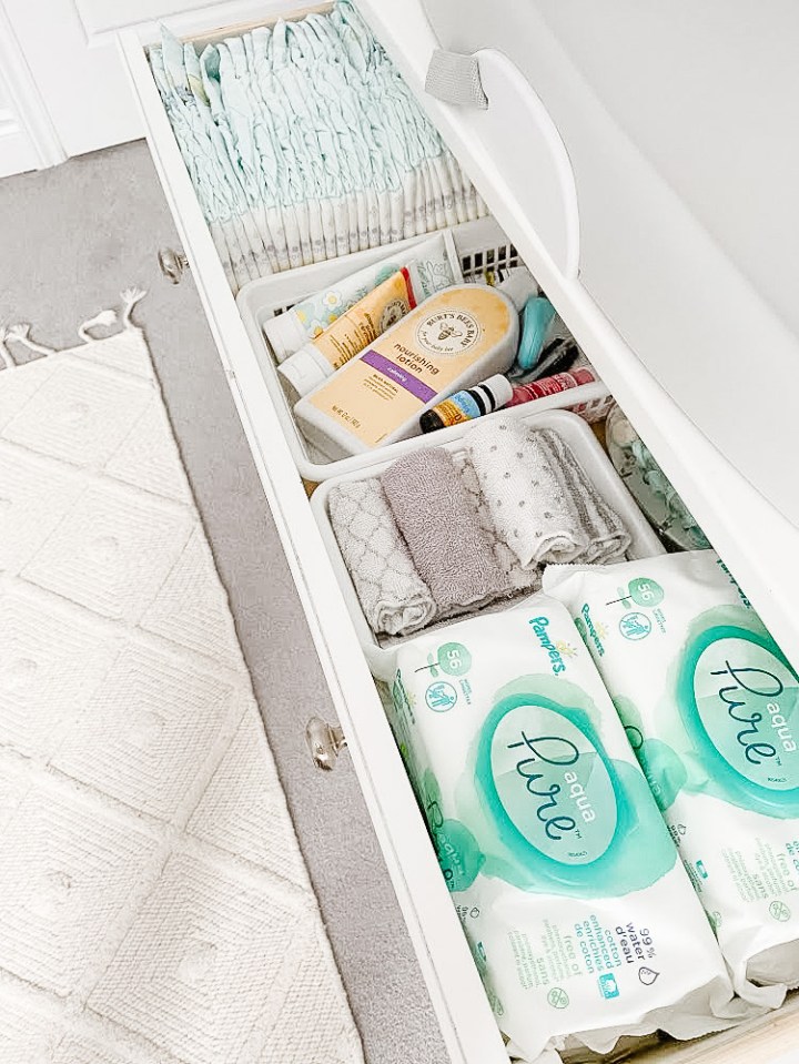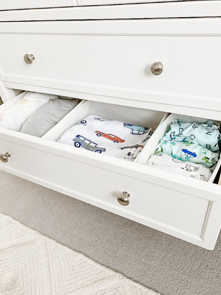 I wanted to have small dresser in my son’s nursery so that I could not only use it for organizing his clothes but also his changing table. The first drawer is organized with his diapers, wipes and loose items such as soother, teething meds, and wash clothes. Very easy to access to these items when I am changing and best part – it’s all hidden in the drawer.