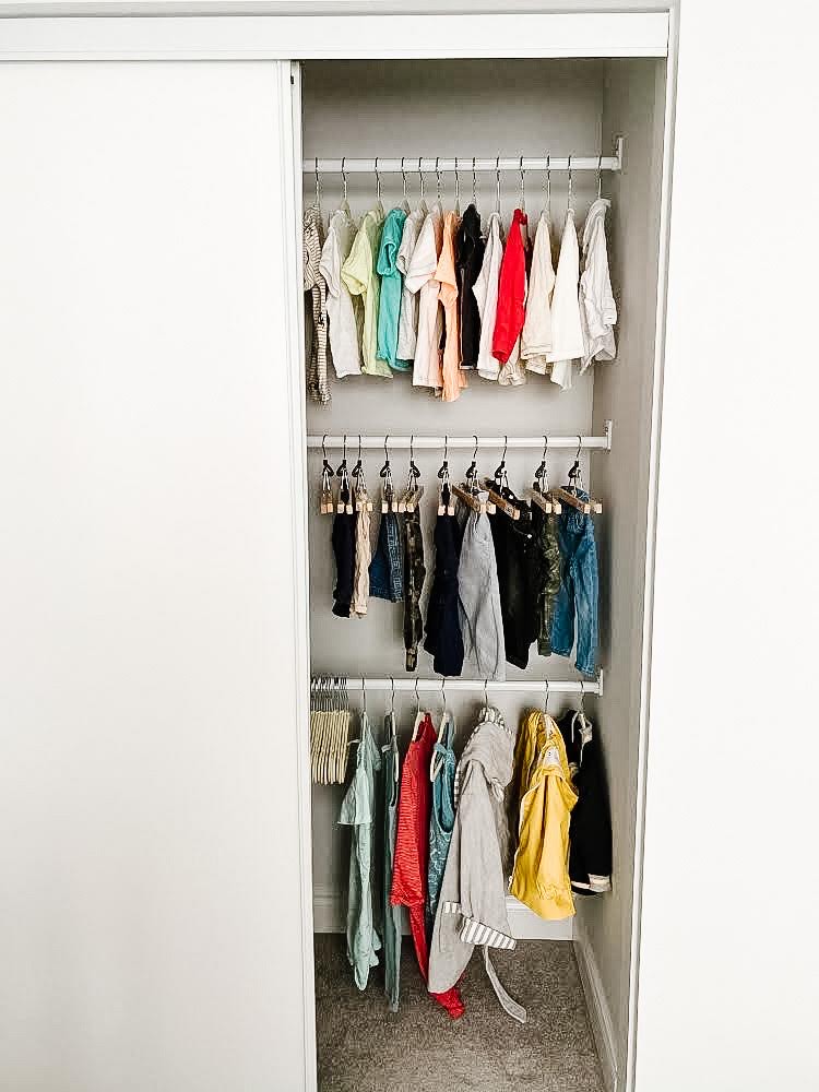 I wanted a baby closet but at the same time I wanted a closet that could work for him in the future. So I made sure to have three rods, low enough so that I could hang his small clothes.